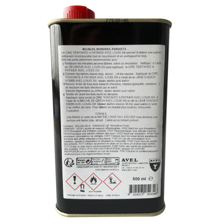 Vous souhaitez restaurer vos meubles anciens en bois ? Redonner un coup de jeune à des bois éclaircis (meubles, parquet, escalier ...) ? Teinter des bois neufs ou décapés en les cirant ? Découvrez sans plus attendre la cire teintante Antiquaires & ébénistes coloris noyer 500 ml Louis XIII de la marque Avel ! Composée de cire d'abeille et de térébenthine, la cire teintante Avel vous permettra d'obtenir une superbe patine antiquaire tout en nourrissant et protégeant le bois.
