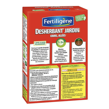 Ce désherbant jardin, cours et allées de la marque Fertiligène est destiné, comme son nom l'indique, au désherbage des cours, allées et jardin. Il permet une efficacité express : les effets sont visibles dès 3 heures après application.