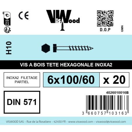 Pour tous vos travaux de fixation, de vissage et d'assemblage dans le bois, équipez-vous de cette Boite 20 vis bois tirefond 6 x 100/60mm tête hexagonale Inox A2 - Viswood. Ces vis à bois DIN 571 peuvent être serrées avec une clé de serrage ou une clé à cliquet.