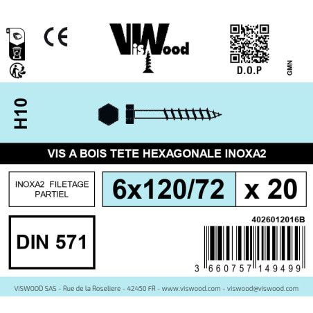 Pour tous vos travaux de fixation, de vissage et d'assemblage dans le bois, équipez-vous de cette Boite 20 vis bois tirefond 6 x 120/72mm tête hexagonale Inox A2 - Viswood. Ces vis à bois DIN 571 peuvent être serrées avec une clé de serrage ou une clé à cliquet.