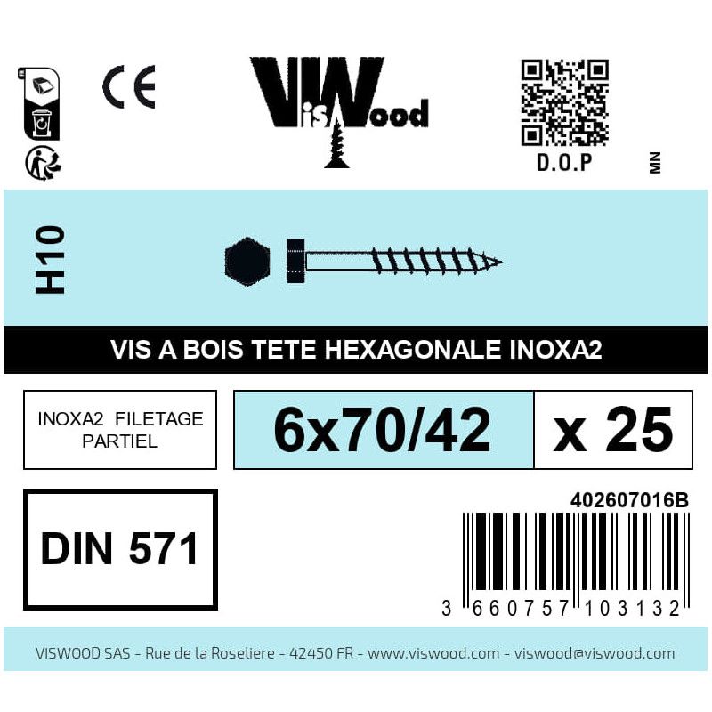 Pour tous vos travaux de fixation, de vissage et d'assemblage dans le bois, équipez-vous de cette Boite 25 vis bois tirefond 6 x 70/42mm tête hexagonale Inox A2 - Viswood. Ces vis à bois DIN 571 peuvent être serrées avec une clé de serrage ou une clé à cliquet.
