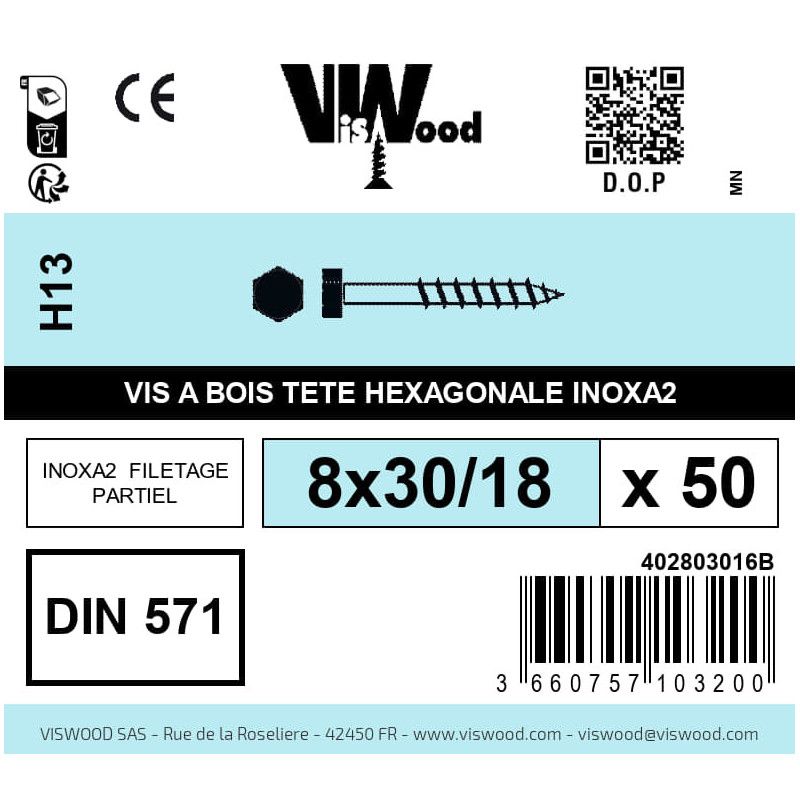 Pour tous vos travaux de fixation, de vissage et d'assemblage dans le bois, équipez-vous de cette Boite 50 vis bois tirefond 8 x 30/18mm tête hexagonale Inox A2 - Viswood. Ces vis à bois DIN 571 peuvent être serrées avec une clé de serrage ou une clé à cliquet.