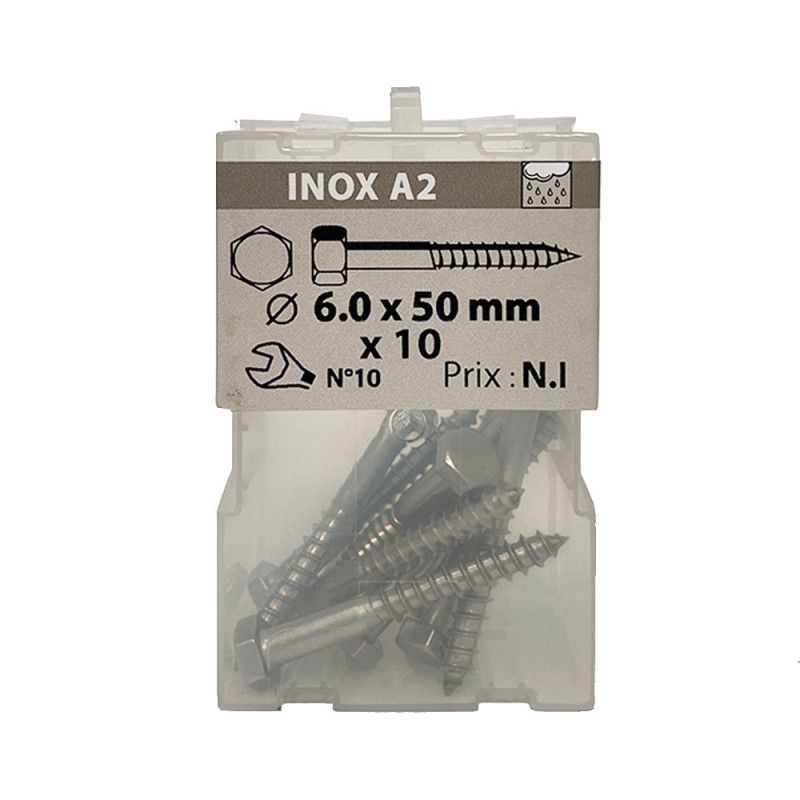 Pour tous vos travaux de fixation, de vissage et d'assemblage dans le bois, équipez-vous de cette boite de 10 vis à bois 6 x 50mm tête hexagonale en inox A2. Ces vis à bois DIN 571 peuvent être serrées avec une clé de serrage ou une clé à cliquet.