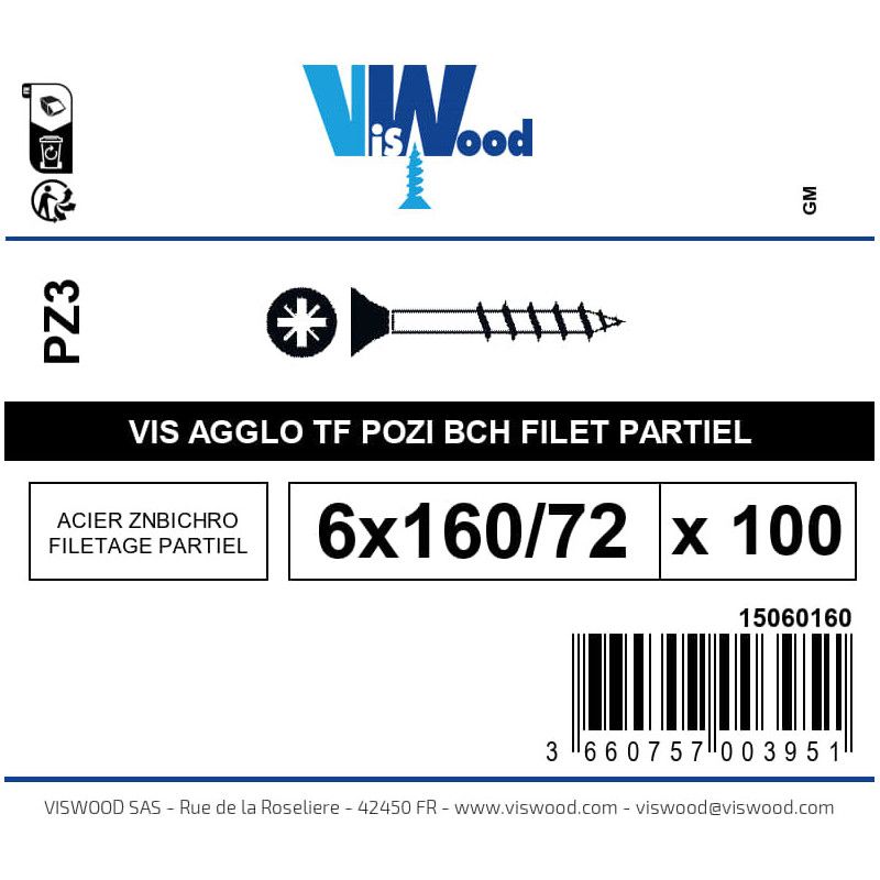 La Boite 100 vis agglo 6 x 160/72mm tête Fraisée Pozidriv Acier zingué bichromaté - Viswood est idéale pour vos travaux de fixation sur bois et aggloméré. Avec leur tête fraisée et leur finition en acier zingué bichromaté, ces vis assurent une résistance élevée à la corrosion tout en offrant une fixation solide. Leur empreinte Pozidriv garantit un vissage précis et sécurisé, parfait pour les professionnels comme pour les bricoleurs.