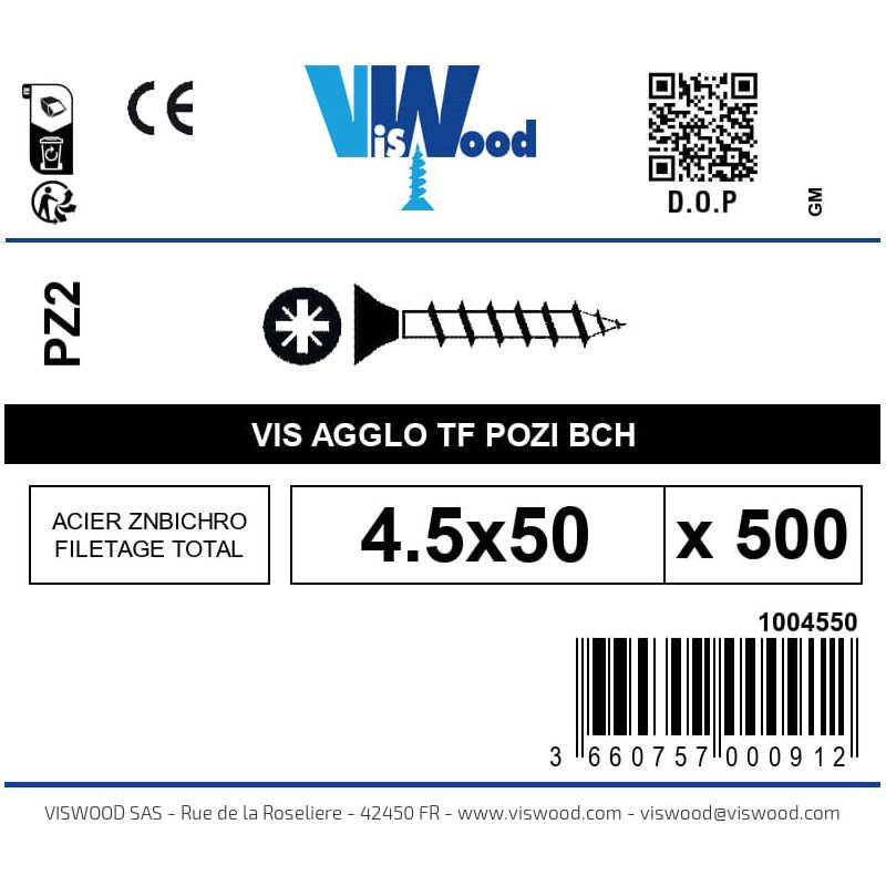 La Boite 500 vis agglo 4.5 x 50mm tête Fraisée Pozidriv Acier zingué bichromaté - Viswood est idéale pour vos travaux de fixation sur bois et aggloméré. Avec leur tête fraisée et leur finition en acier zingué bichromaté, ces vis assurent une résistance élevée à la corrosion tout en offrant une fixation solide. Leur empreinte Pozidriv garantit un vissage précis et sécurisé, parfait pour les professionnels comme pour les bricoleurs.