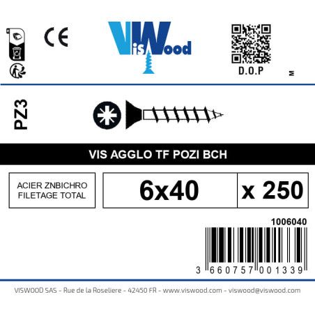 La Boite 250 vis agglo 6 x 40mm tête Fraisée Pozidriv Acier zingué bichromaté - Viswood est idéale pour vos travaux de fixation sur bois et aggloméré. Avec leur tête fraisée et leur finition en acier zingué bichromaté, ces vis assurent une résistance élevée à la corrosion tout en offrant une fixation solide. Leur empreinte Pozidriv garantit un vissage précis et sécurisé, parfait pour les professionnels comme pour les bricoleurs.