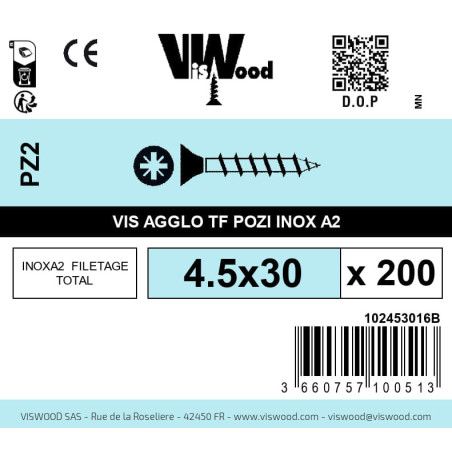 La Boite 200 vis agglo 4.5 x 30mm tête Fraisée Pozidriv Inox A2 - Viswood est conçue pour garantir une fixation robuste et durable sur bois et aggloméré. Fabriquées en inox A2, elles offrent une excellente résistance à la corrosion, idéales pour une utilisation en extérieur. Leur tête fraisée et empreinte Pozidriv assurent un vissage précis et sécurisé, parfait pour les professionnels et les bricoleurs.