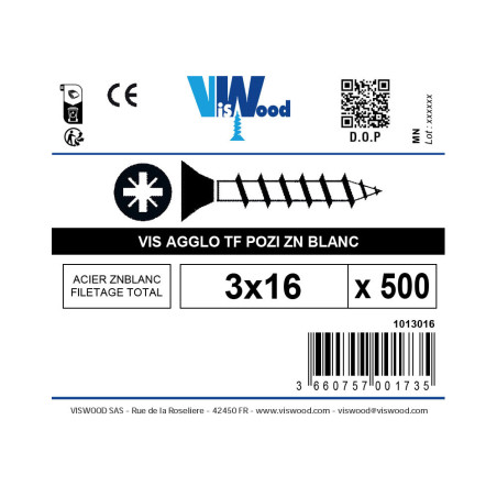 Idéal pour vos travaux de vissage dans du bois aggloméré. Optez pour la boîte de 500 vis agglo 3 X 16mm tête fraisée pozidriv, filetage complet en acier zingué.