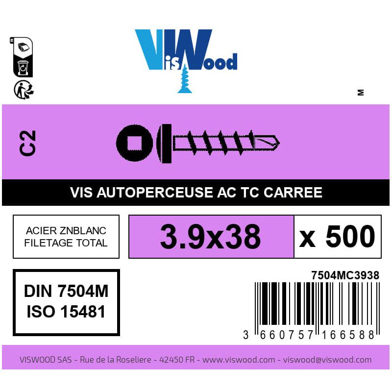 Optez pour la Boite 500 vis autoperceuses 3.9 x 38mm tête cylindriquee carrée zingué de la marque française Viswood. idéales pour des fixations rapides et résistantes en milieux humides. Parfaites pour le métal. elles assurent un vissage sans pré-perçage. Disponible sur Tout Brico !