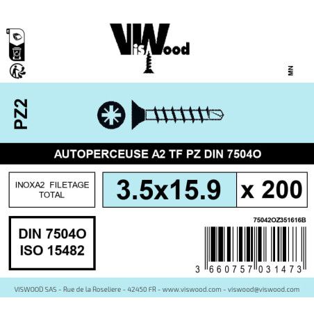 Optez pour la Boite 200 vis autoperceuses 3.5 x 15.9mm tête fraisée pozidriv inox A2 de la marque française Viswood. idéales pour des fixations rapides et résistantes en milieux humides. Parfaites pour le métal. elles assurent un vissage sans pré-perçage. Disponible sur Tout Brico !
